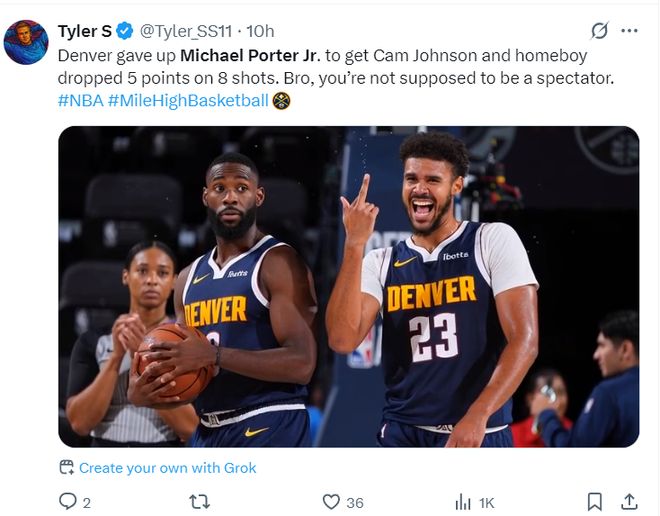 一天之前,卡梅伦-约翰逊迎来了掘金首秀,全场比赛32分钟,8中2+三分6中1仅拿5分,掘金媒体怒喷:哥们儿,掘金用1个首轮签+MPJ换来你不是看戏的!