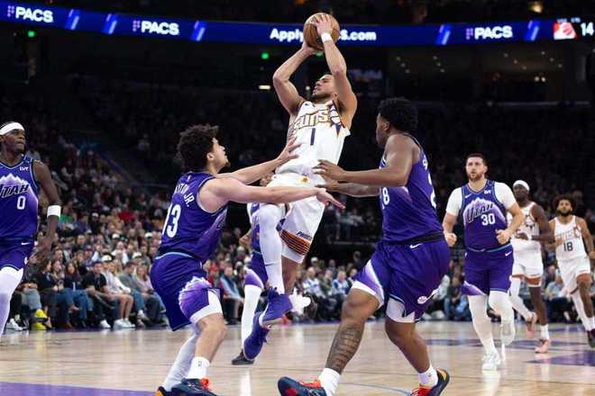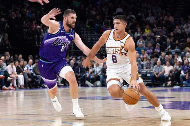 中场休息回来,太阳继续被拉开66-76落后,并在之后维持69-79落后。布克与马威内外开花,太阳打出13-2攻势反超1分,双方继续交替领先,爵士在马尔卡宁引领下回敬一波小高潮夺回领先优势,太阳单节25-30再输5分,三节结束太阳86-94落后爵士。前三节比赛,布克20+4+7与马威17+5,引领太阳4人得分上双,马尔卡宁31+11引领爵士也是4人得分上双。