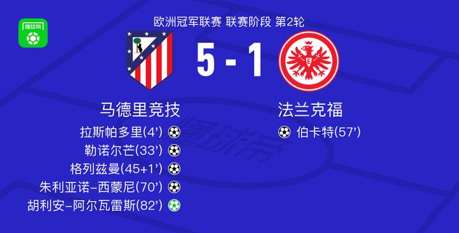 北京时间10月1日欧洲冠军联赛 联赛阶段 第2轮,马德里竞技对阵法兰克福。马德里竞技拉斯帕多里破门,勒诺尔芒破门,格列兹曼破门,朱利亚诺-西蒙尼破门,胡利安-阿尔瓦雷斯破门。法兰克福伯卡特破门。最终比分马竞 5-1 法兰克福。