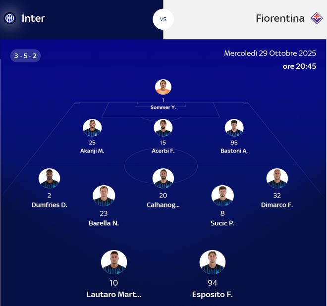 1-索默/95-巴斯托尼、15-阿切尔比、25-阿坎吉/32-迪马尔科、8-苏契奇、20-恰尔汗奥卢、23-巴雷拉、2-邓弗里斯/94-皮奥、10-劳塔罗