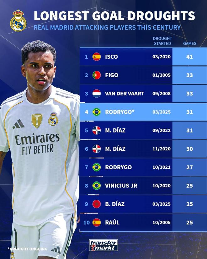 德国转会市场网站列出了皇马攻击手本世纪最长进球荒排行榜,目前的罗德里戈以31场位列第四。