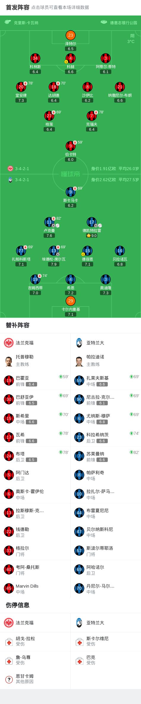 在欧洲冠军联赛联赛阶段第5轮的较量中,亚特兰大与法兰克福展开对决。上半场,卢克曼和斯卡马卡相继射门击中立柱弹出。下半场,德凯特拉雷助攻,卢克曼打破僵局。随后,卢克曼助攻,埃德松-席尔瓦建功、斯卡马卡射门击中横梁弹出,CDK补射得分。全场比赛结束,亚特兰大客场3-0击败法兰克福。